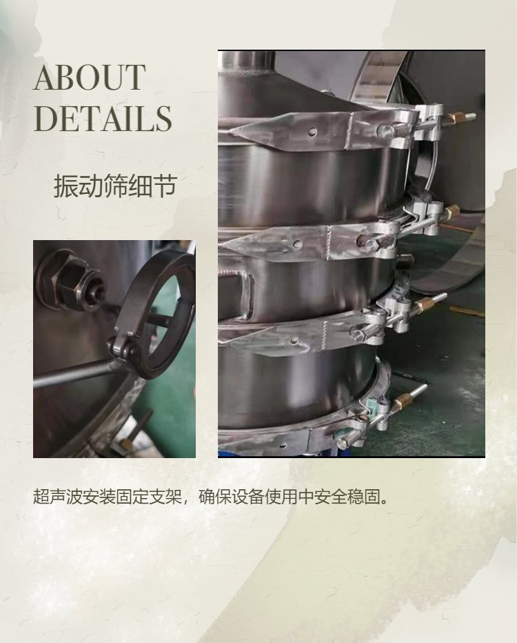 超聲波篩分系統由超聲波諧振電源、振蕩器、共振環組成。超聲波諧振電源産生的高頻電振蕩由振蕩器轉換成高頻正弦形式的縱向振蕩波,這些振蕩波傳到共振環上使共振環産生共振,然後由共振環将振動均勻傳輸至篩面。篩網上的物料在做低頻振動的同時,疊加上超聲波振動,既可防止網孔堵塞,又可提高篩分産量和質量。